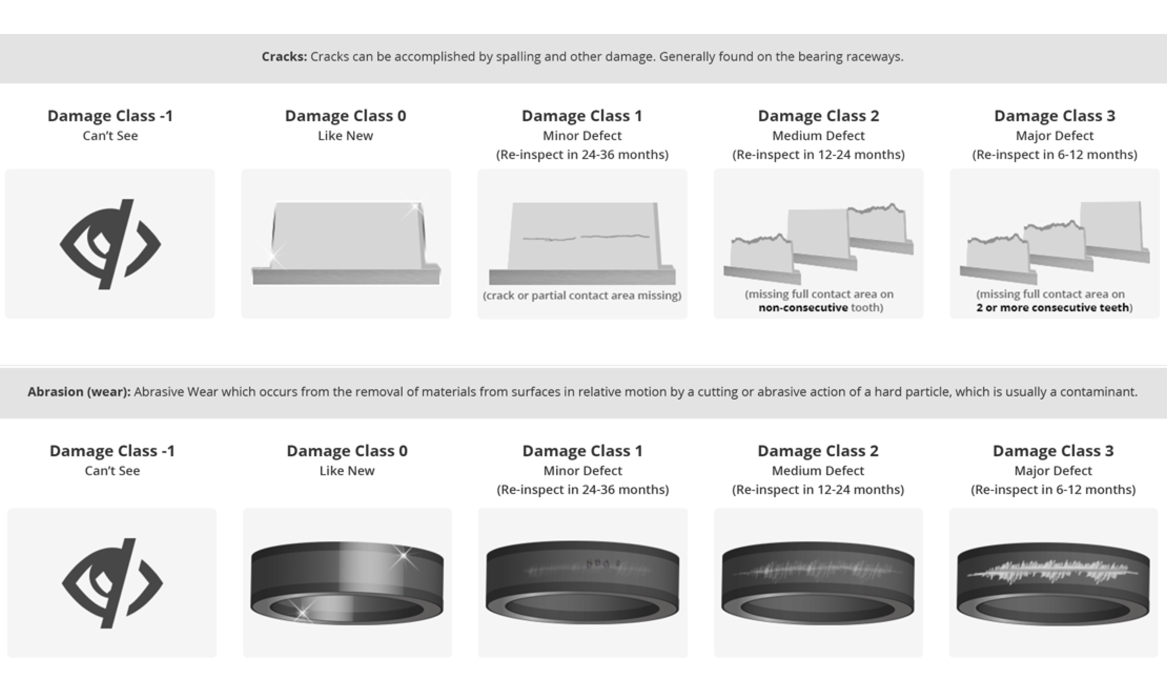 Bearing and Gears can go through different states of damge throughout there life. These graphics help engineers compare their borescope images against these images to understand what type of damage they're dealing with. (These graphics were part of an industrial magazine article).