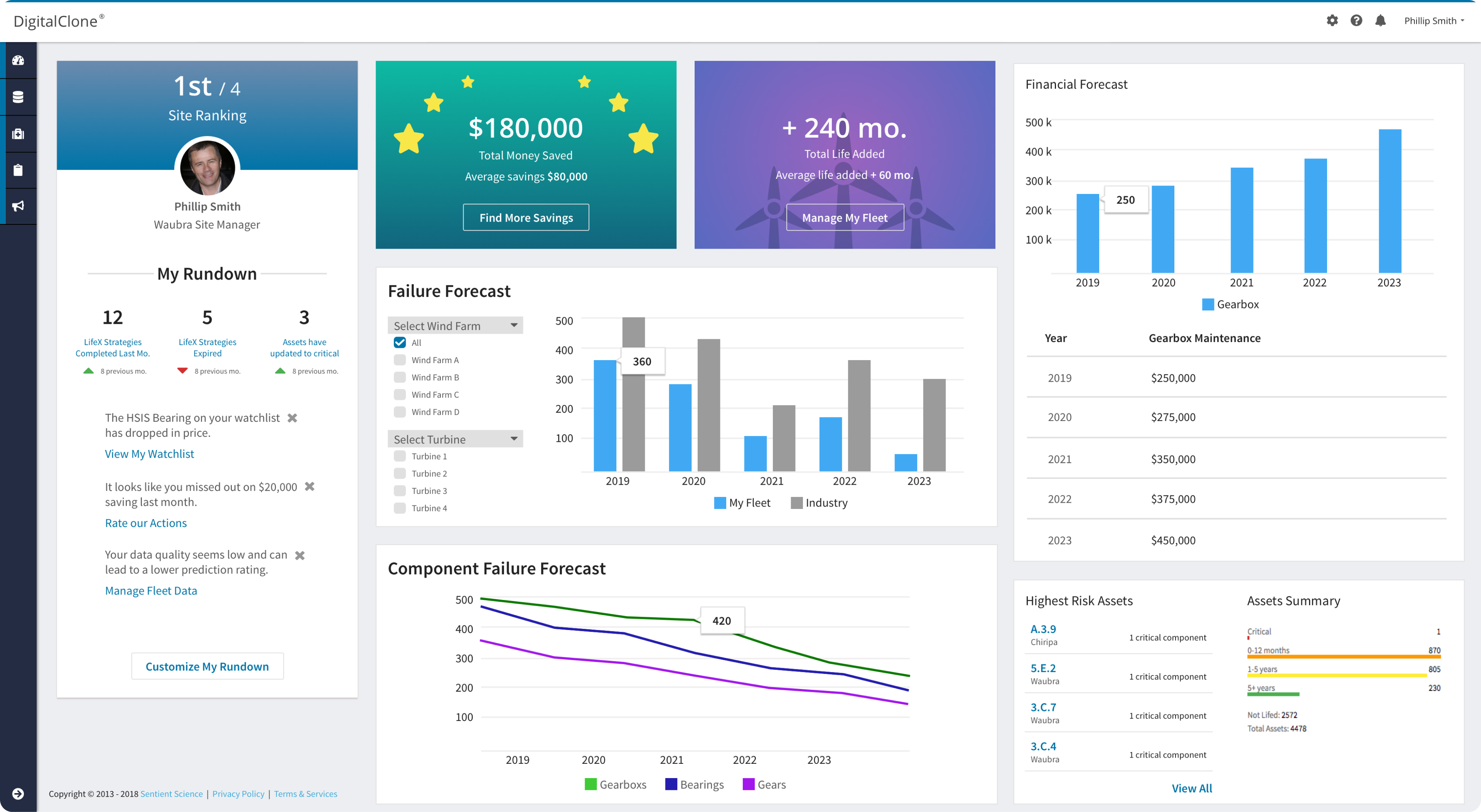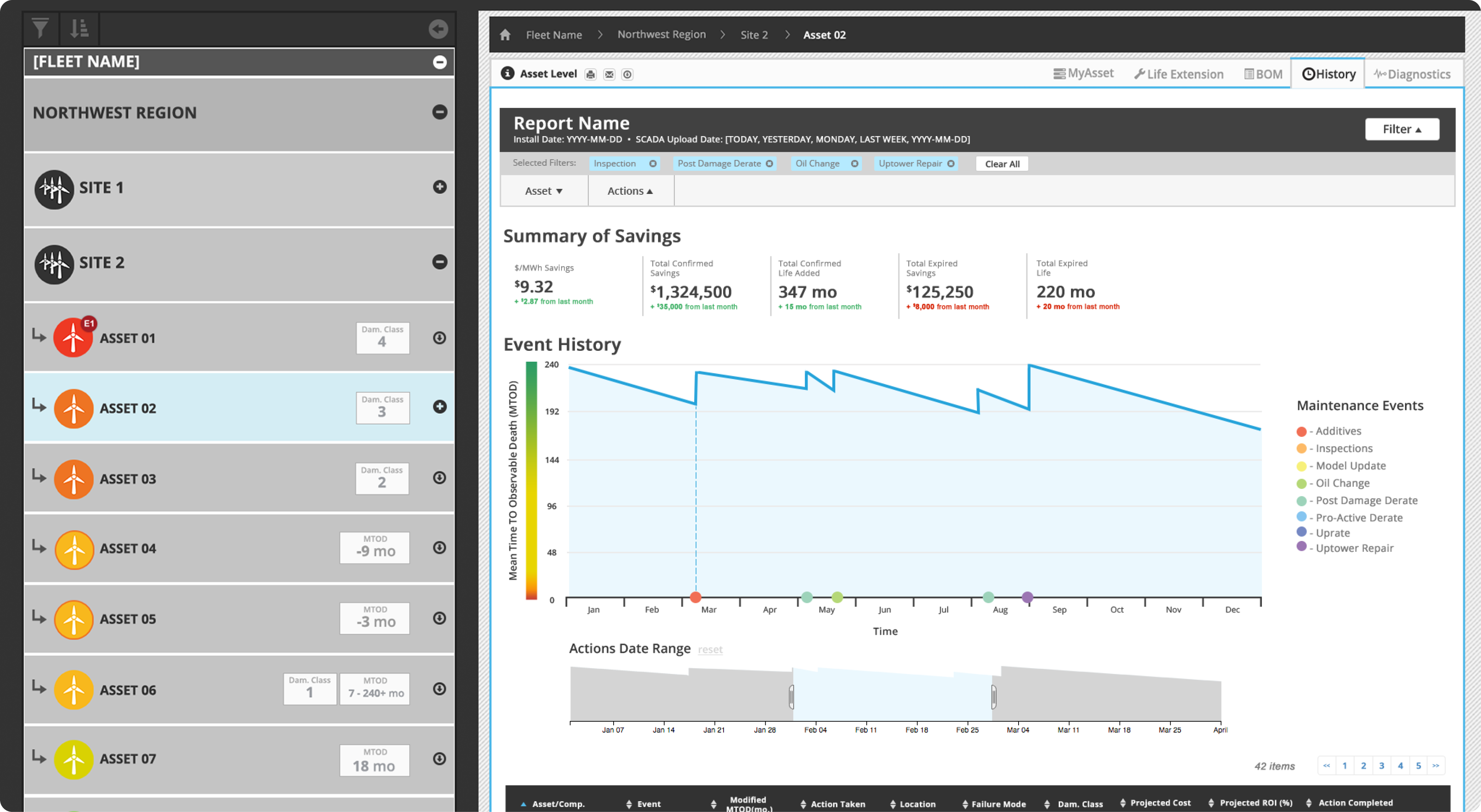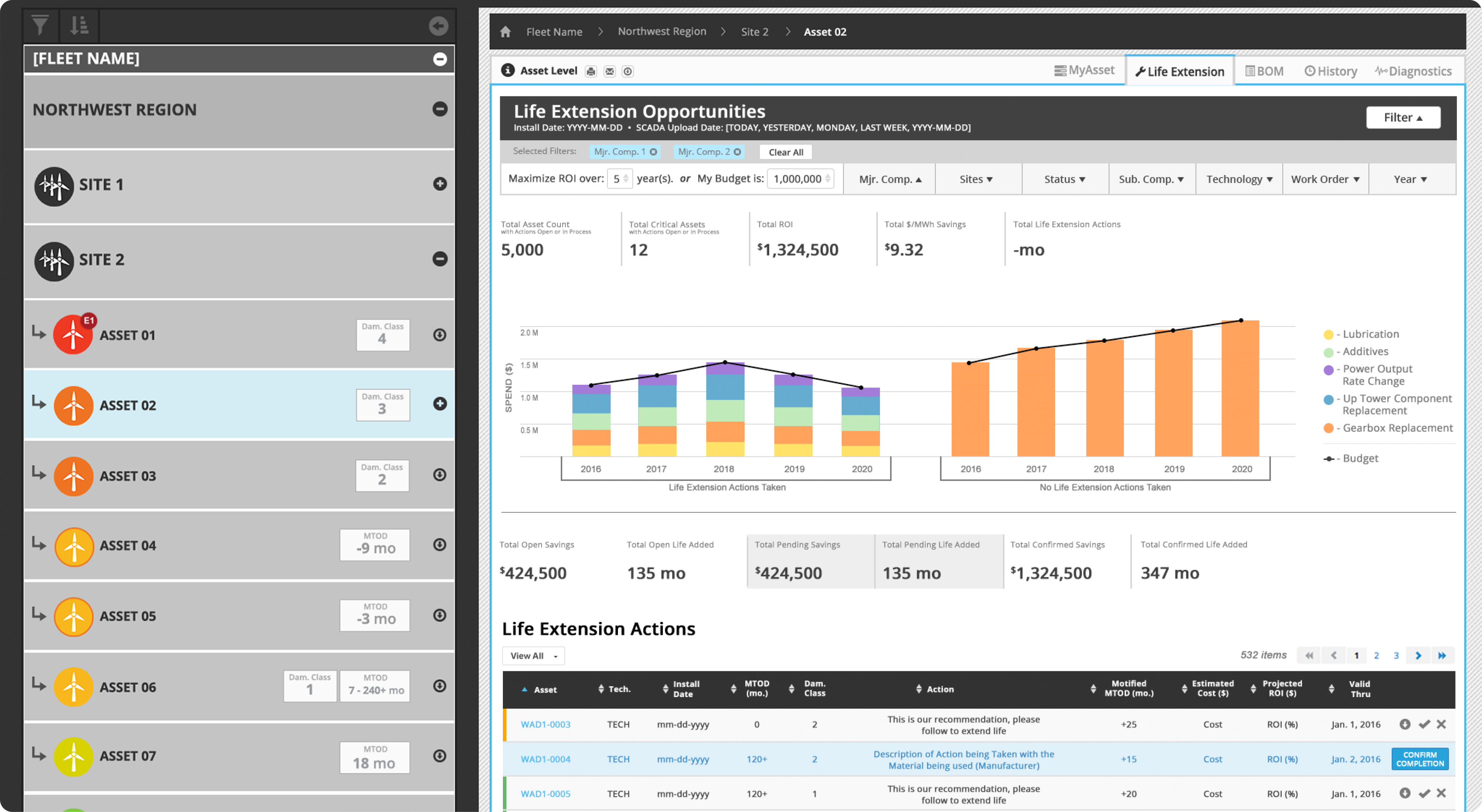 A high-level view of how customer assets are performing, encompassing metrics such as life added, money saved, financial forecasts, and failure forecasts.